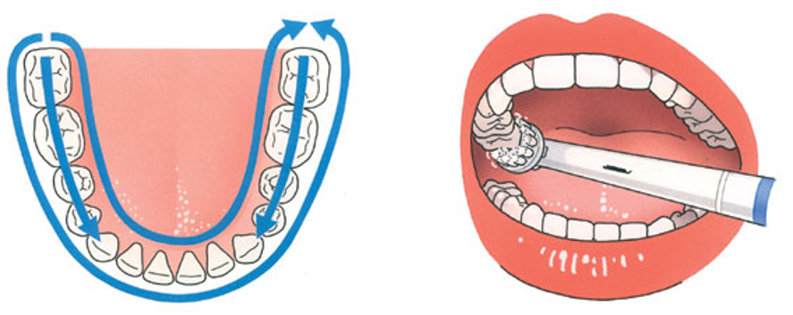 Als u een elektrische tandenborstel met de sonische technologie gebruikt, kunt u de poetstechniek zoals hieronder is beschreven gebruiken. Uiteraard is het bij deze tandenborstel voldoende om de borstel op de tanden en kiezen te plaatsen. U hoeft dus niet zelf de poetsbeweging te maken.